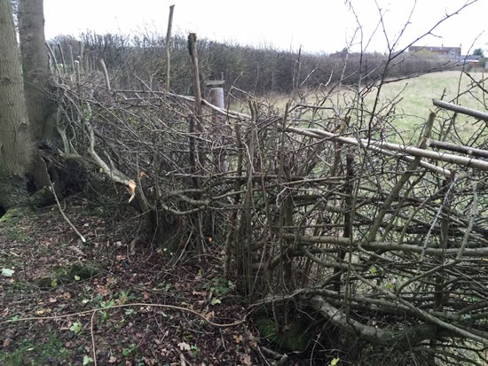 If you don’t know what hedge-laying is all about, take a look at the hedge in this photo that the group started and completed on the 29th November. By their own admission, it might not be the best example of hedge-laying, but it will do the job it needs to – keeping out the farmer’s sheep and deterring the deer from coming into the wood to snack on succulent new tree growth.